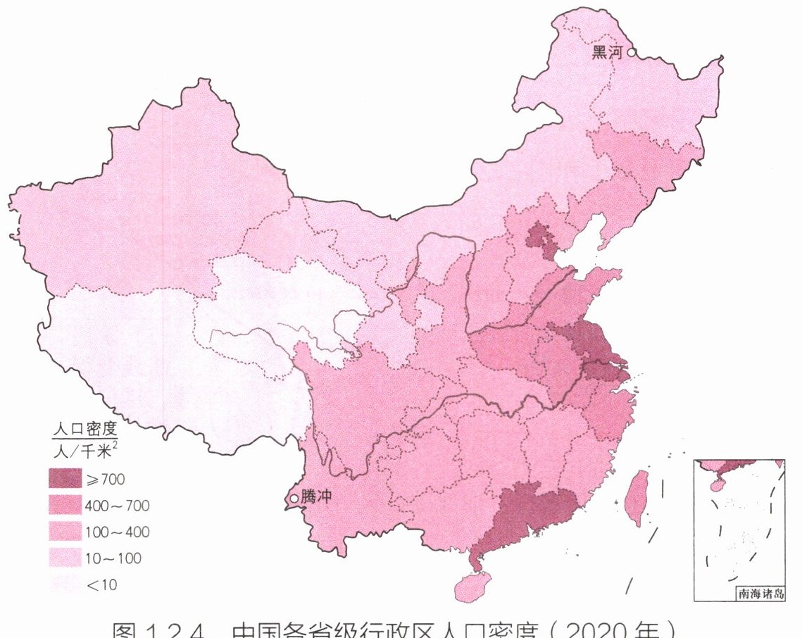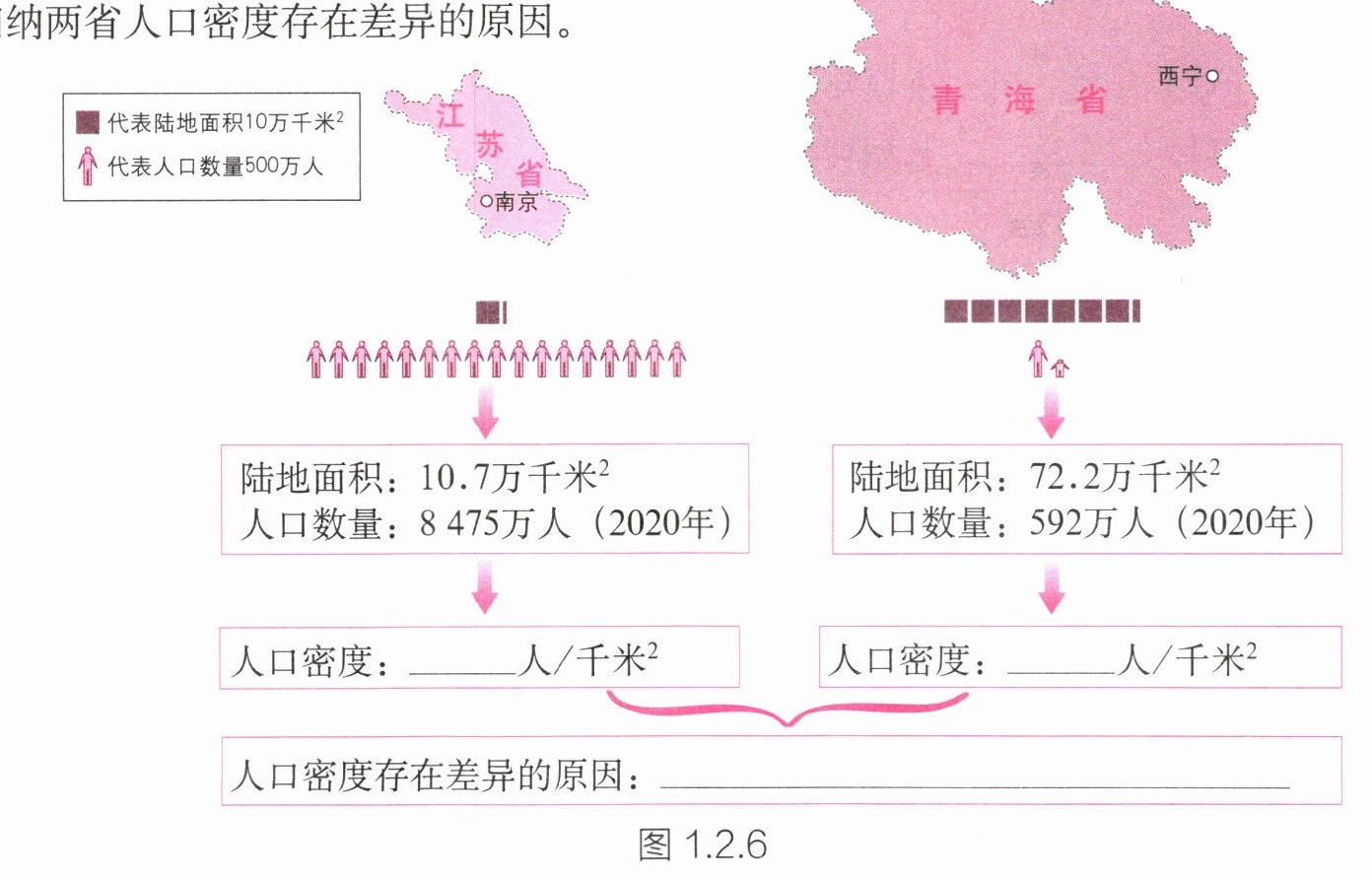 读图 1.2.6,计算江苏省和青海省的人口密度(保留整数),归纳两省人口密度存在差异的原因。