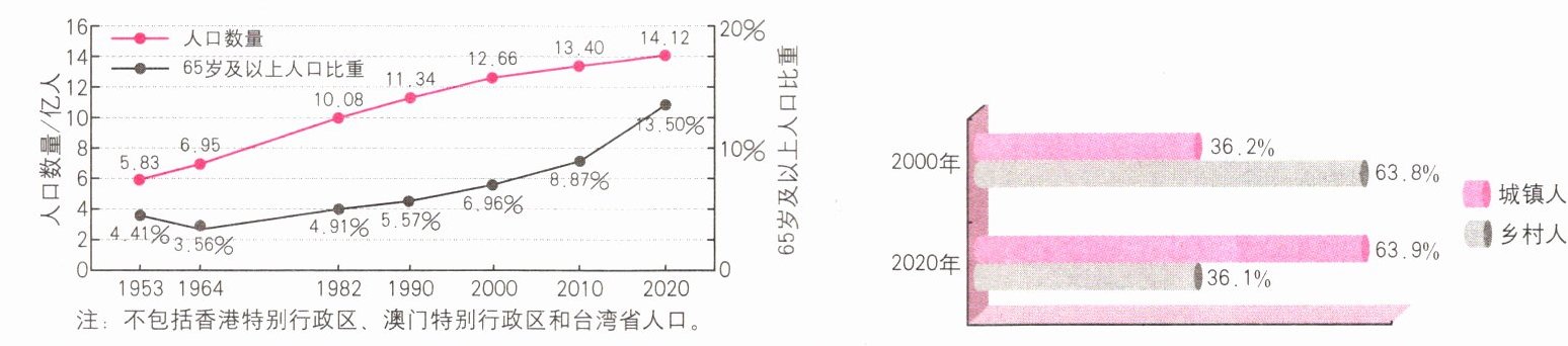 )图 1.1 中国人口数量和 65 岁及以上人口比重变化 图 1.2 2000 年和 2020 年中国城乡人口构成