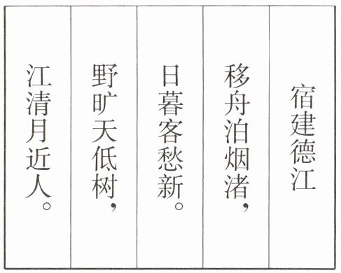 | 江清月近人。 | 野旷天低树, | 日暮客愁新。 | 移舟泊烟渚, | 宿建德江 |
