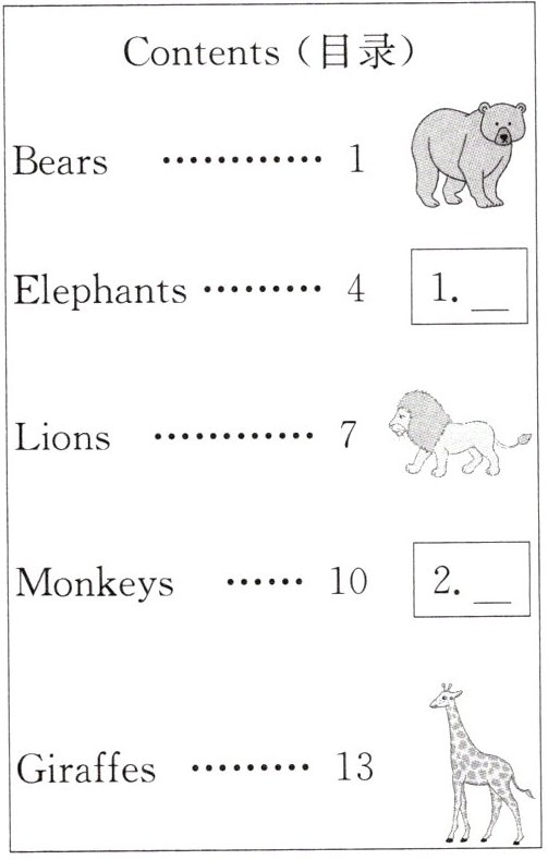 四、Look,read and finish. 明明阅读了一本关于野生动物的书籍,下面是书籍的目录。根据目录,完成下列任务。