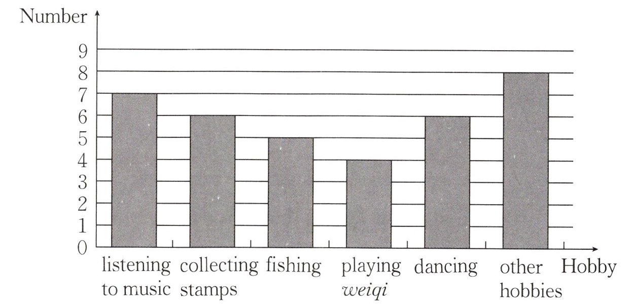 七、Look,read and judge. 根据班上同学的兴趣爱好统计图,完成下列任务。
