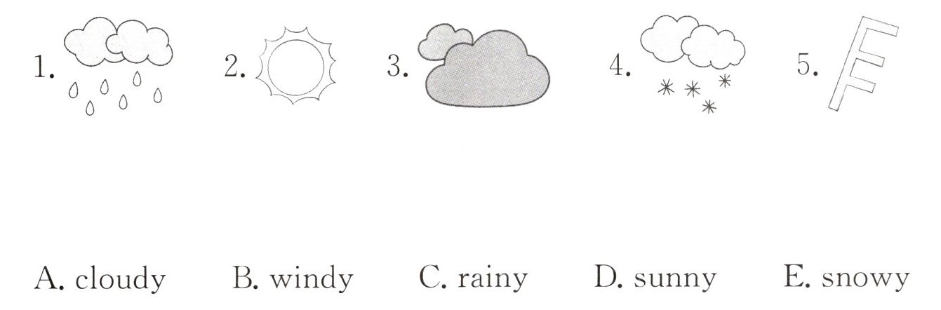 二、根据 Look,say and sing 部分,将下列天气图标与对应的单词相连。