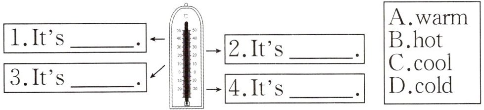 四、Look, read and choose. 根据箭头所指向的温度,选择正确的选项补全句子。