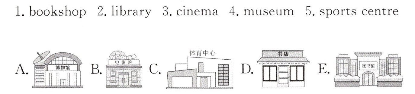 1. bookshop 2. library 3. cinema 4. museum 5. sports centre