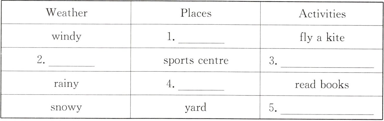任务一:1. park 2. sunny 3. go swimming 4. library 5. make a snowman 任务二:略
