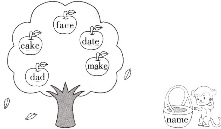一、Read and match. 摘果子游戏。读一读,将画线部分发音与篮子里单词画线部分发音相同的苹果放进篮子。(连一连)
