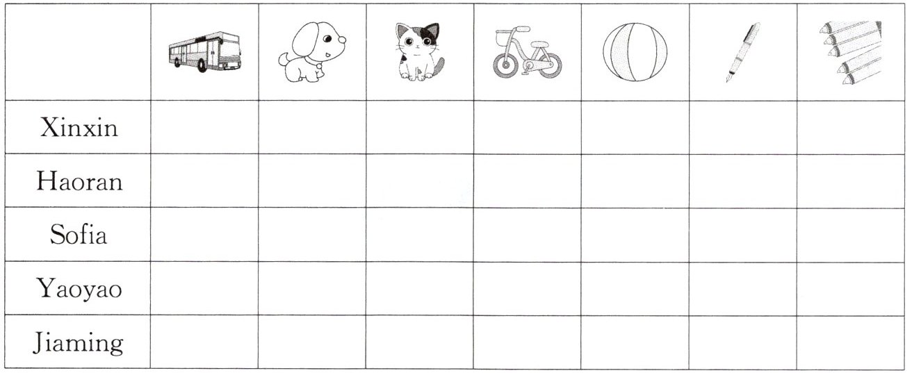 Hello,I'm Xinxin. I have a toy cat and a pen. Haoran has a toy bus and a toy bike. Sofia has a toy dog and some crayons. Yaoyao has a toy cat and a ball. Jiaming has a toy bike and a ball.