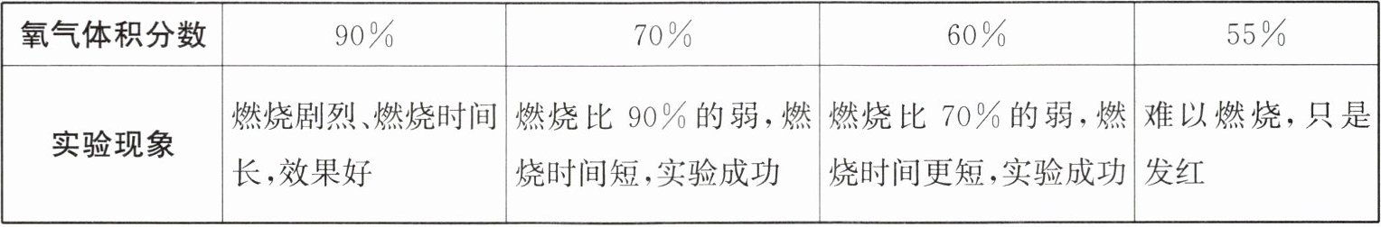 【实验内容】取直径为 0.38 mm 的铁丝,分别在体积分数为 90%、70%、60%、55%的氧气中实验。