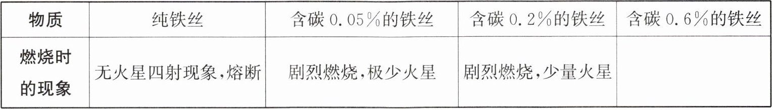 。(3) 下表是小明将纯铁丝和不同含碳量的铁丝(铁丝直径均为 0.4 mm)放入氧气中燃烧时的实验现象的记录。请你分析完成下表: