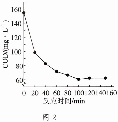 (2)0~100 min内,反应时间越长,COD值越小,则臭氧催化氧化的效果越好;100~160 min内,臭氧催化效果达到一定程度,就基本不会再变化了