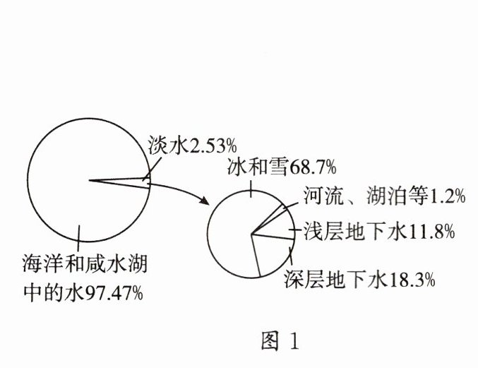 ①由图1可知,可供人类直接利用的淡水资源占全球水储量的2.53%。