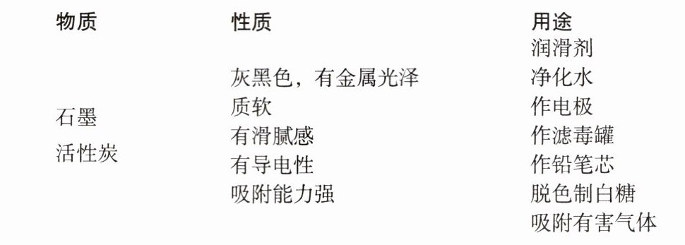 石墨-质软-作铅笔芯;石墨-有滑腻感-润滑剂;石墨-有导电性-作电极;活性炭-吸附能力强-净化水;活性炭-吸附能力强-作滤毒罐;活性炭-吸附能力强-脱色制白糖;活性炭-吸附能力强-吸附有害气体。