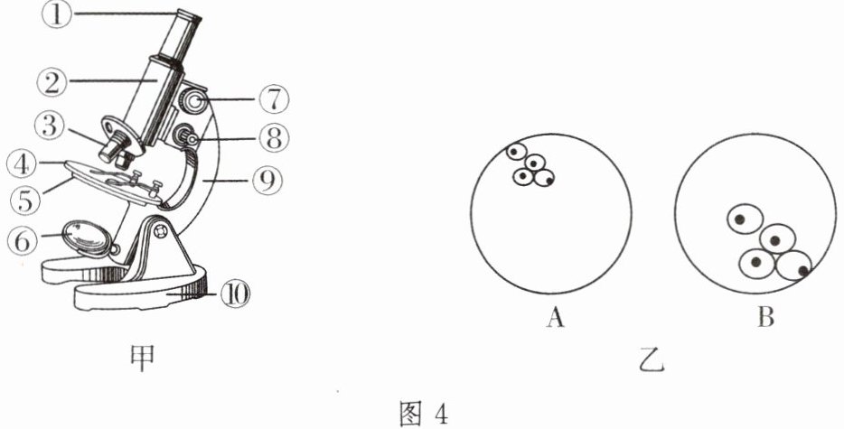 16. 图4甲为单目显微镜结构示意图,乙为显微镜下观察细胞时看到的两个视野及视野中的物像。请据图回答下列问题。