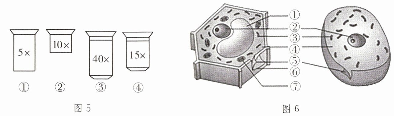 17. 在某农业科研基地,科研人员对新培育的草莓品种进行细胞结构研究。图5是显微镜镜头,图6是动植物细胞结构模式图。请据图回答问题。