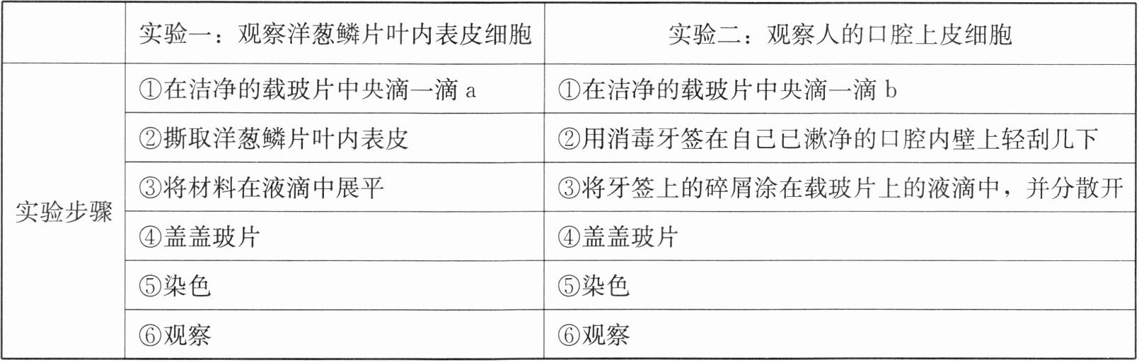 | 实验步骤 | ①在洁净的载玻片中央滴一滴a | ①在洁净的载玻片中央滴一滴b |