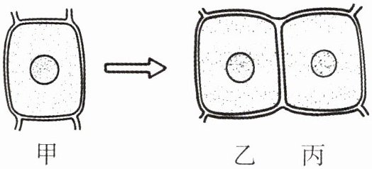 14. (2025·成都)细胞分裂是生物体生长、发育和繁殖的基础。细胞甲经分裂形成乙、丙两个新细胞(如图 1.3.1 - 4),下列关于该过程的叙述,正确的是( )。
