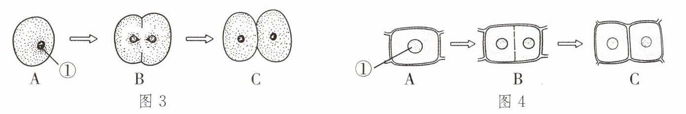 18. 图 3 和图 4 是两类生物细胞的分裂过程,请据图回答问题。