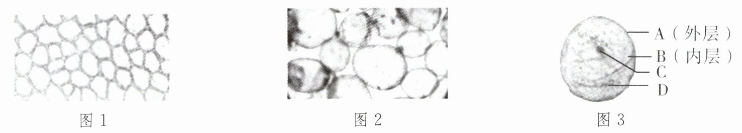 16. 小明在市场购买成熟的红番茄,用显微镜观察番茄果皮细胞(图1)和果肉细胞(图2、图3)并拍摄了显微图像。请据图回答下列问题。