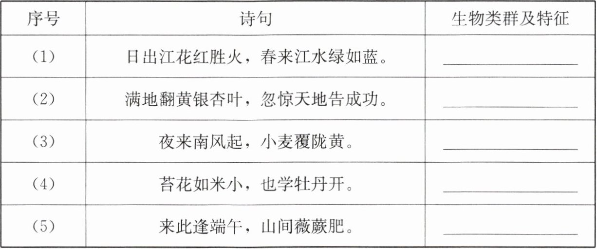 19. 古诗词中蕴含丰富的生物学知识,彰显出自然之美、生命之美,请将下列诗句中描述的生物所属类群和特征的序号填写在诗句后面。