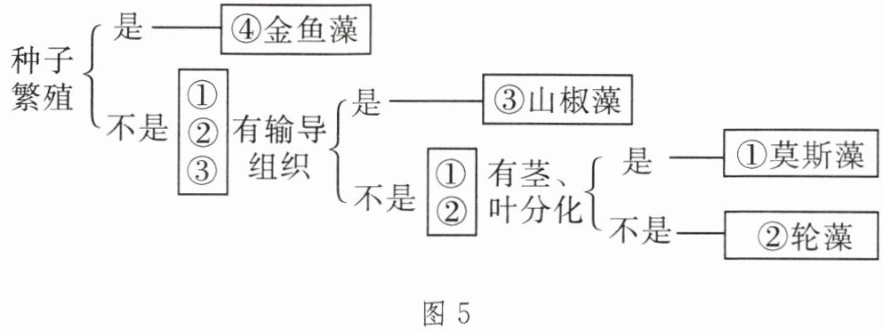 18. 鱼缸造景是一项新兴艺术,常用到金鱼藻、山椒藻、莫斯藻、轮藻等水草,这四种“藻”其实分属于藻类、苔藓植物、蕨类植物、种子植物。大家可以通过分析它们的形态结构及繁殖方式(如图5)找到答案。