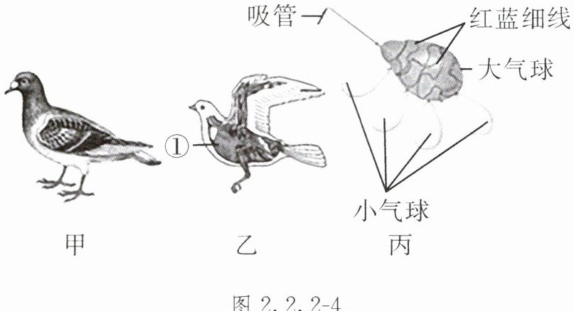 14. (2024·无锡)鸟类有多种适应飞行生活的特征,生物学兴趣小组在学习鸟类相关内容时,用吸管、皮筋、大气球、小气球、红蓝细线等材料制作了一个鸟类的呼吸模型。图2.2.2-4甲、乙、丙分别是家鸽的外形、肌肉以及呼吸模型示意图,请据图回答下列问题。