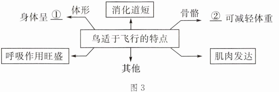 19. 多数鸟能够在天空中自由翱翔。有人说:“鸟的全身都是为飞行而设计的。”图 3 是小李同学构建的鸟适于飞行运动特点的概念图,请据图回答相关问题。