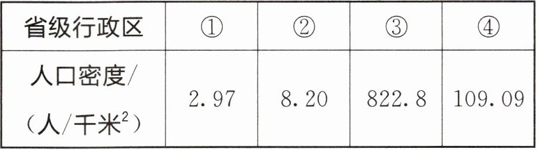 我国是世界人口密度较大的国家之一。2020年,我国人口密度约为147人/千米$^2,$约为世界人口密度的2.5倍。然而,我国人口分布极不均匀。表1-2为2020年中国4个省级行政区的人口密度表。读表,完成4~5题。