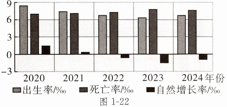 图1-22为2020—2024年中国人口出生率、人口死亡率和人口自然增长率统计图。读图,完成1~3题。