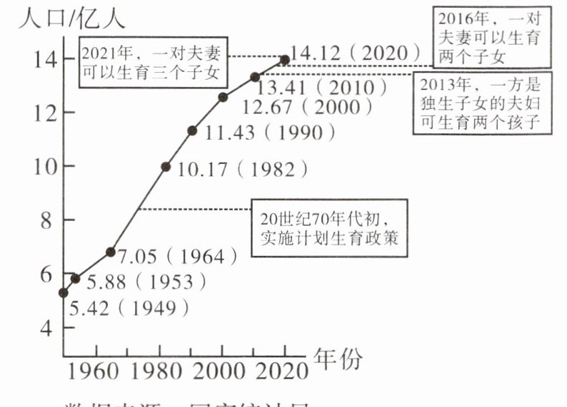 自1982年计划生育政策被确定为基本国策以来,我国计划生育政策随着人口形势和社会发展需求持续变化。图1-23为1949—2021年中国人口数量及计划生育政策变化示意图。读图,完成6~7题。