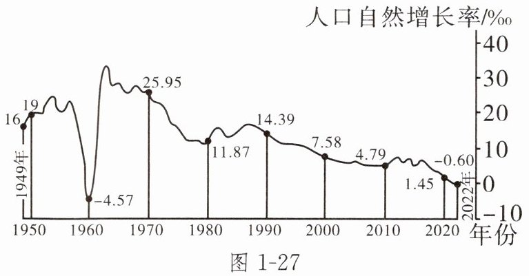 (2023年贵州黔东南)人口负增长是指人口出生率水平低于人口死亡率导致人口自然增长率为负值,在不考虑迁移、流动的封闭情况下,总人口规模将由增加转为减少,且持续而难以逆转的人口发展过程。图1-27为我国1949年以来人口自然增长率统计图。读图,完成1~2题。