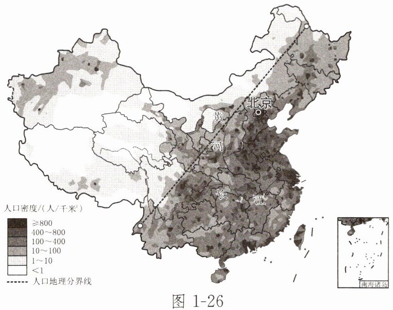 (1)在图1-26中标出胡焕庸线的起止点,并归纳中国人口的分布特点。