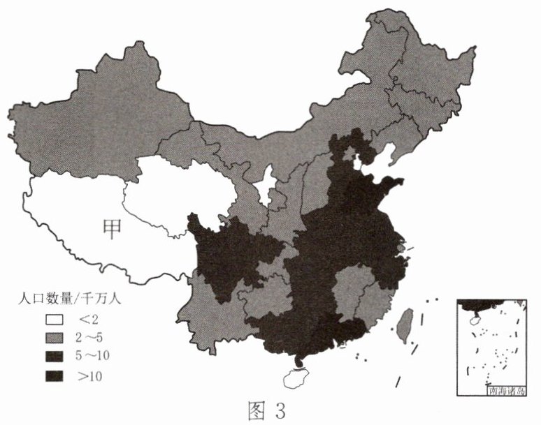 我国疆域辽阔,人口众多。近年来,我国人口发展呈现少子化、老龄化、区域人口增减分化的趋势性特征。图 3 为第七次全国人口普查各省级行政区常住人口数量分布图。读图,完成 9~12 题。