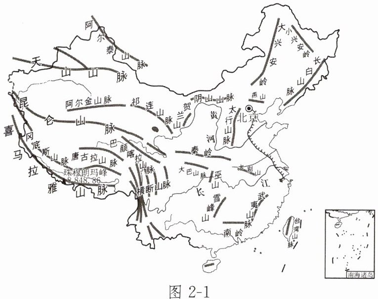 (1)东西走向的山脉。靠北的一列是____山脉和阴山山脉,中间的一列是昆仑山脉和____,靠南的一列是____。