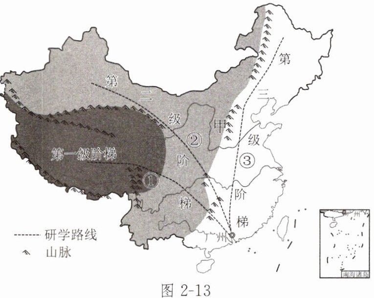 10.暑假,广州某中学地理研学小组设计了①②③三条研学路线。图2-13为中国地势三级阶梯及研学路线示意图。读图,完成下列各题。
