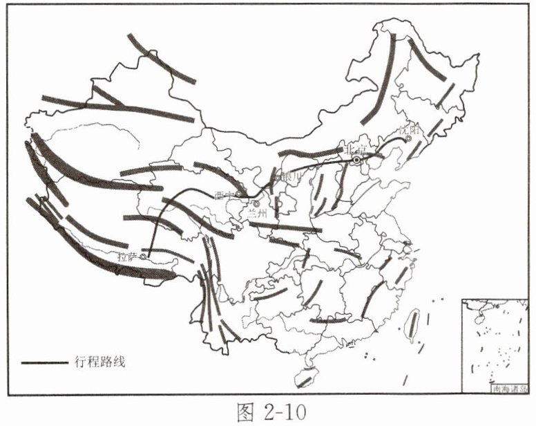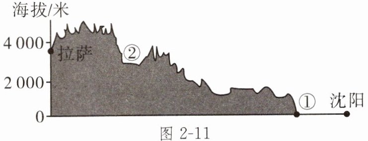 9.几名游客以体验和探索地理景观为目的,从沈阳出发,沿国道自驾前往拉萨旅游。图2-10为行程路线示意图,图2-11为沿途地形剖面示意图,图2-12为青藏高原景观图。读图,完成下列各题。