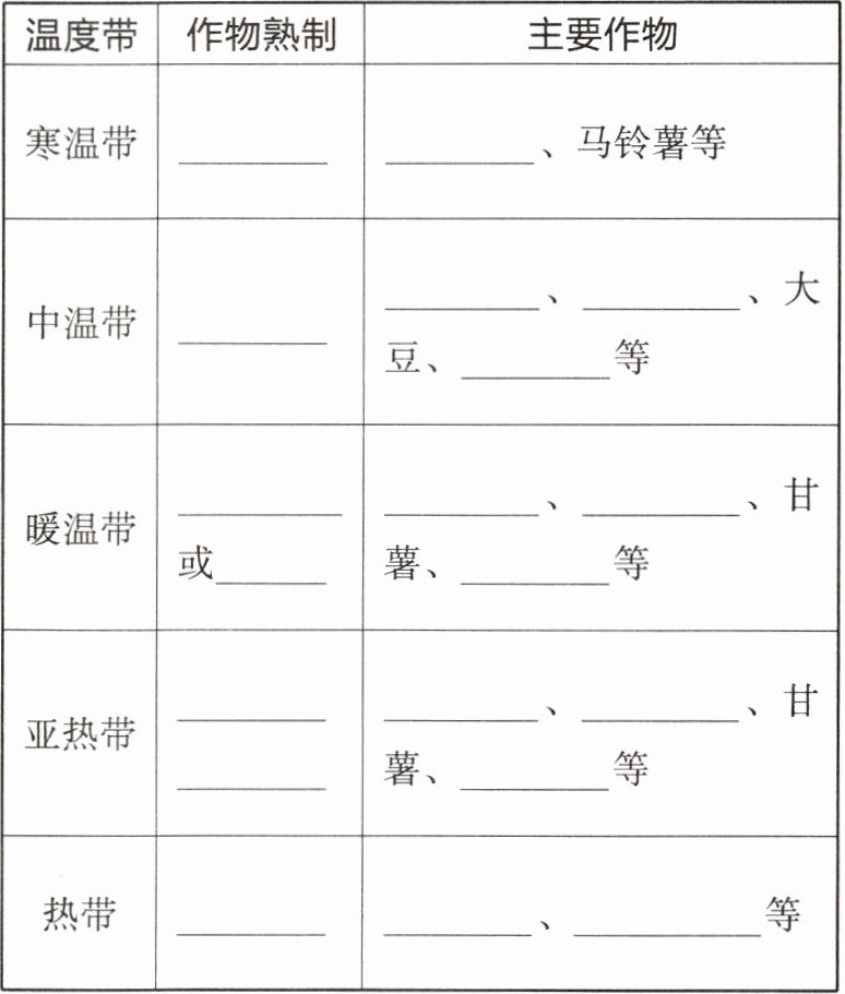 ②一年一熟 春小麦 一年一熟 春小麦 玉米 甜菜 两年三熟 一年两熟 冬小麦 玉米 花生 一年两熟到三熟 水稻 油菜 茶叶 一年三熟 水稻 热带作物