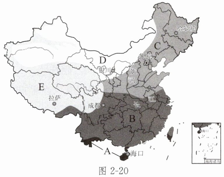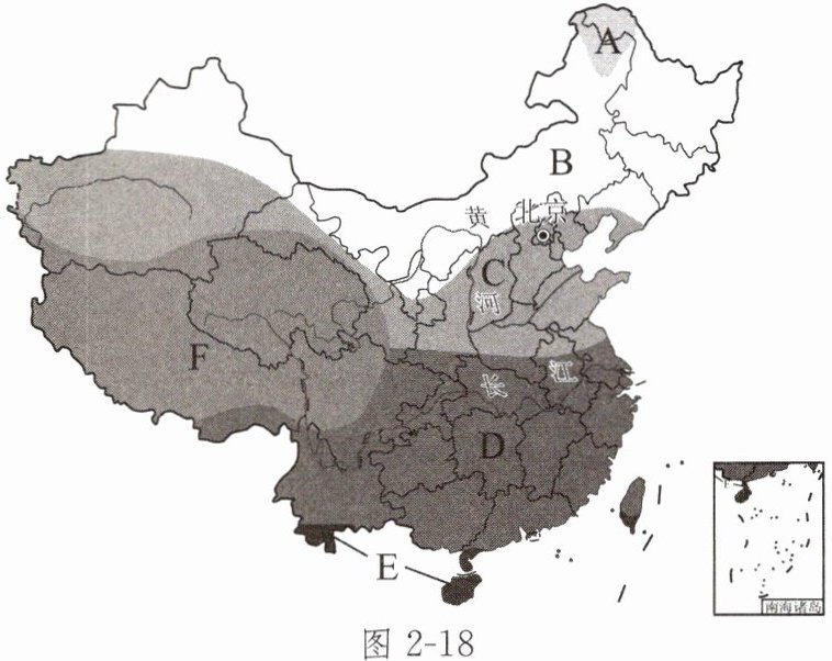 ①图2 - 18中,A为______,B为______,C为______,D为______,E为______,F为高原气候区。其中,亚热带与暖温带的分界线大致与秦岭—淮河线吻合,接近1月0℃等温线。