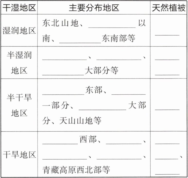 |湿润地区|东北山地、______以南、______东南部等|______|