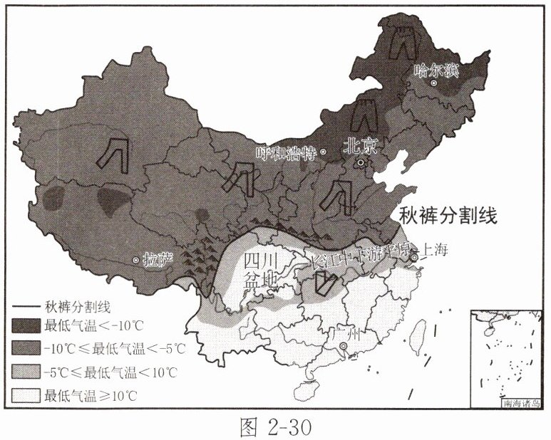 (2) 图中“秋裤分割线”大致与我国1月0℃等温线相吻合,大致经过______线;此线还与我国______毫米年等降水量线大体一致。