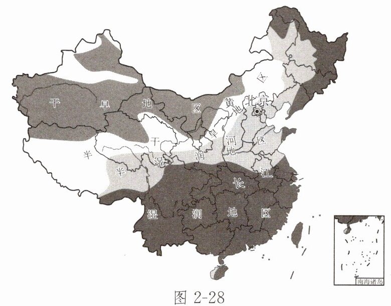 每年5月21日或20日为我国小满节气。南方地区民谚“小满小满,江河渐满”,意思是雨水开始增多,江河水位上涨。图2 - 28为中国干湿地区的划分示意图,图2 - 29为中国季风区与非季风区分布图。读图,完成8~10题。