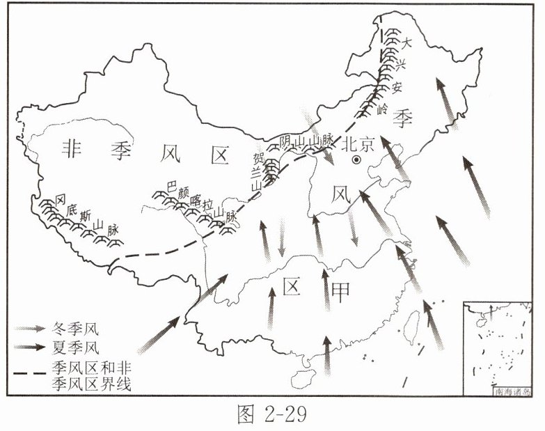10. 如果图2 - 29中甲季风推进迅速且在北方滞留时间长,则容易出现( )。