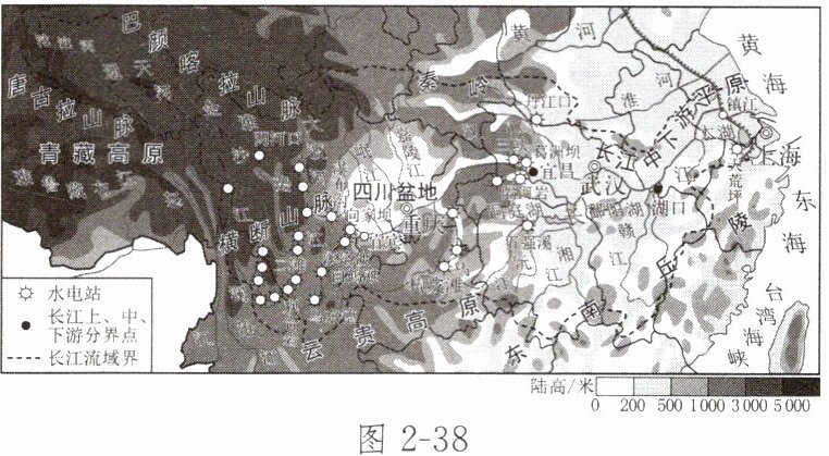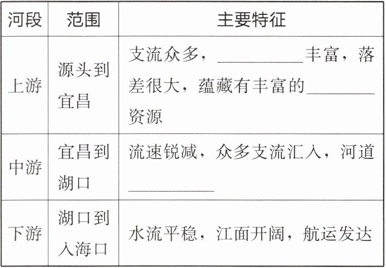 |上游|源头到宜昌|支流众多,______丰富,落差很大,蕴藏有丰富的______资源|