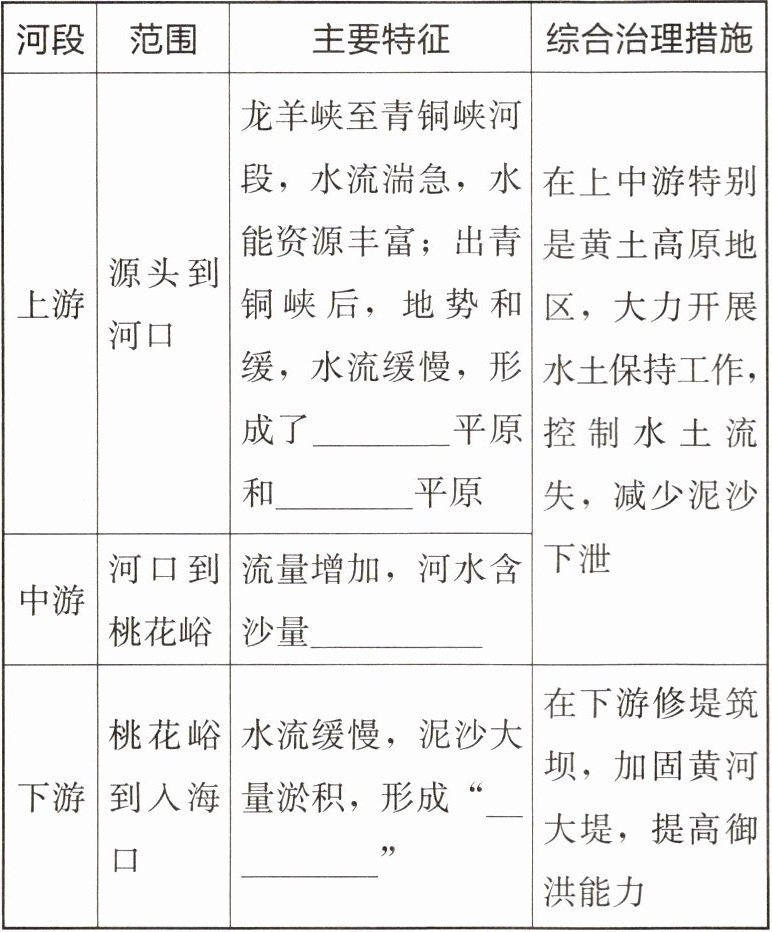 |上游|源头到河口|龙羊峡至青铜峡河段,水流湍急,水能资源丰富;出青铜峡后,地势和缓,水流缓慢,形成了______平原和______平原|在上中游特别是黄土高原地区,大力开展水土保持工作,控制水土流失,减少泥沙下泄|