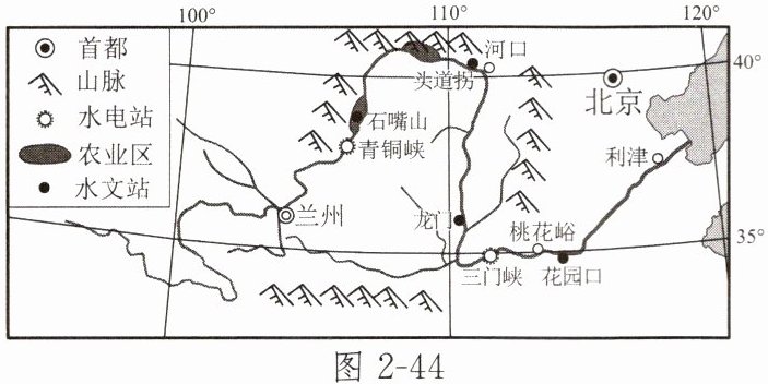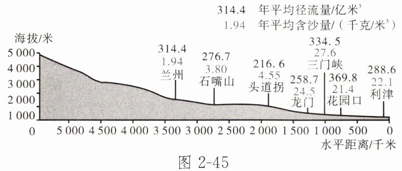 习近平总书记一直十分关心黄河的保护和治理。习近平总书记强调,“保护黄河是事关中华民族伟大复兴的千秋大计”,“治理黄河,重在保护,要在治理”,“坚定不移走生态优先、绿色发展的现代化道路”。图2-44为黄河示意图,图2-45为黄河干流纵剖面示意及主要水文站观测数据图。读图,完成6~8题。