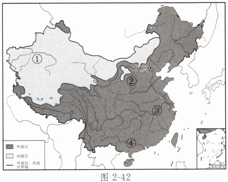 图2-42为中国外流区与内流区分布图。读图,完成1~2题。