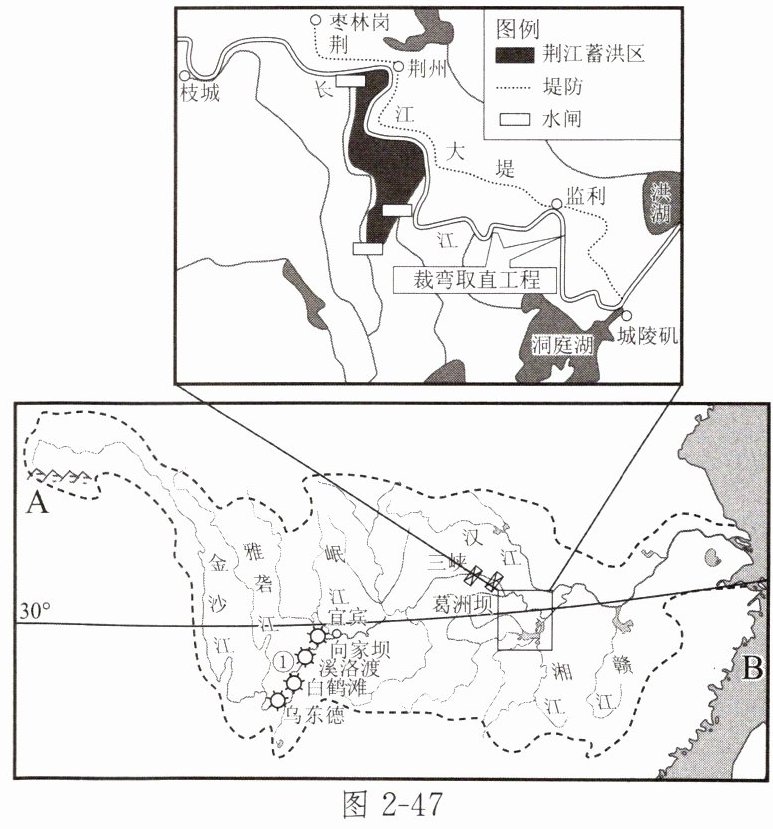 11. 习近平总书记强调,长江是中华民族的母亲河,也是中华民族发展的重要支撑。推动长江经济带发展必须从中华民族长远利益考虑,走生态优先、绿色发展之路,使绿水青山产生巨大生态效益、经济效益、社会效益,使母亲河永葆生机活力。图2-47为长江水系和荆江河段图。读图,完成下列各题。