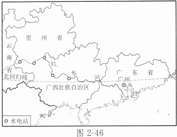 西江是珠江的干流,其上游又称为红水河,流域内山岭连绵,水能资源丰富。图2-46为红水河水电开发示意图。读图,完成9~10题。