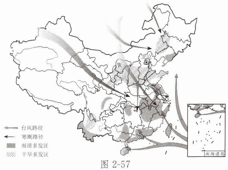 2024 年,我国自然灾害以洪涝和地质灾害、台风、风雹、低温冷冻和雪灾为主,干旱、地震、沙尘暴等灾害也有不同程度发生。图 2-57 为中国主要气象灾害分布图。读图,完成 1~3 题。