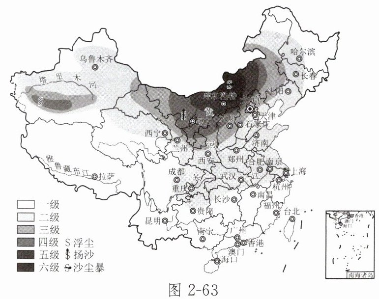 (2024 年江苏苏州)沙尘天气包含浮尘、扬沙和沙尘暴等类型,春季是我国沙尘天气的多发季节。图 2-63 为某日全国空气污染气象条件预报图。读图,完成 1~3 题。