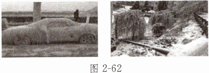 材料 冻雨是在特定的天气背景下产生的降水现象。通俗地说,冻雨就是雨下到地面上和附着物上马上冻结成冰的现象,也就是说它在天上的时候是雨,但是落在地面或附着物上时就凝结成冰。某年 2 月 23—24 日,寒潮将继续影响我国南方地区,预计安徽中南部、湖南大部、贵州东部等地的部分地区将有冻雨或冰粒。图 2-61 为某年 2 月 23—24 日全国冻雨区域预报图,图 2-62 为冻雨灾害图片。